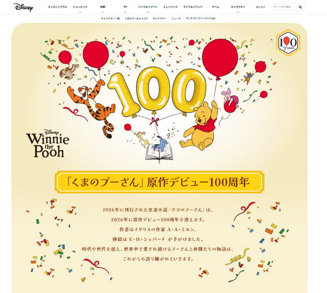 ウォルト・ディズニー・ジャパン株式会社(本社:東京都港区、代表取締役社長:日色保、以下 ディズニー)は、「くまのプーさん」原作デビュー100周を年記念した特設ページを、ディズニー公式サイト(Disney.jp)内にオープンしました。本特設ページでは、「原作デビュー100周年記念 くまのプーさん展」の開催情報をはじめ、記念商品や書籍の紹介を通して、世代を超えて愛されてきたプーさんの歴史と魅力にスポットを当てます。今後もさらに、長年世界中で親しまれてきたプーさんの魅力を新たな形で届ける企画を、2026年を通して展開していきます。 100エーカーの森での冒険を通じて、安らぎやユーモア、そして人生への優しい眼差しを届けてきたプーさんと仲間たちの魅力を発信する、今後の取り組みにぜひご期待ください。