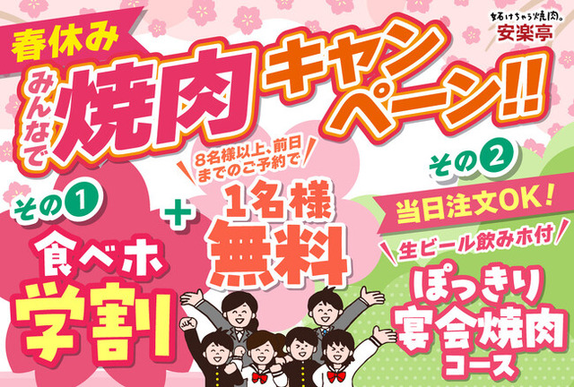 [画像2: https://prcdn.freetls.fastly.net/release_image/38986/282/38986-282-8f87b024772d1d01586bf110da5241d4-1144x1144.jpg?width=536&quality=85%2C75&format=jpeg&auto=webp&fit=bounds&bg-color=fff ]グループ全員学生なら!食べホ学割 500円(税込550円)OFF ♪安楽亭では人気の食べ放題が、グループ全員学生さんなら「学生証」提示で食べ放題が500円OFF(税込550円)!!でおなか一杯!