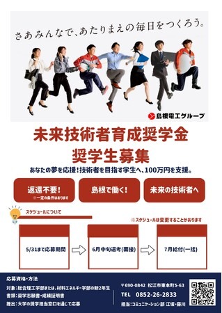 『あたりまえの毎日をつくる』をスローガンに掲げる島根電工グループ〔代表:島根電工株式会社(本社:島根県松江市、代表取締役社長:野津 廣一)、以下、島根電工グループ〕は、このたび学術研究の奨励と地域の担い手となる有望な人財育成を目的として 、島根大学の学生を対象とした無利子、返還不要※の「未来技術者育成奨学金」を設立いたしました。