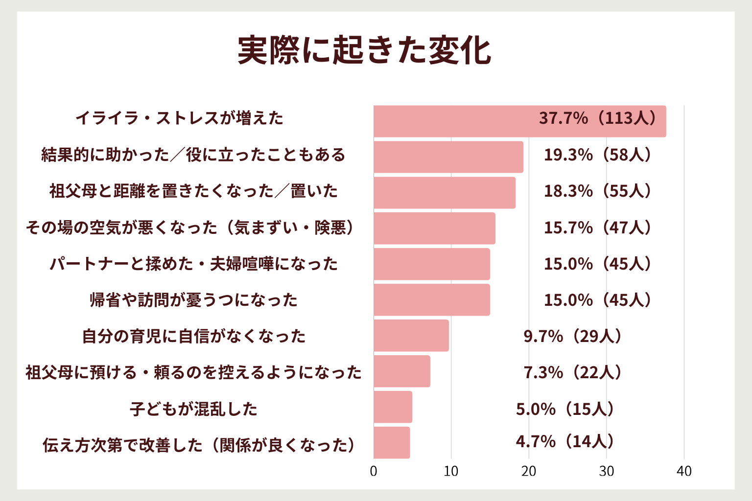 - 実際に起きた変化ではイライラ・ストレスが増えた37.7%(113人)が最多。一方、結果的に助かった/役に立ったこともある19.3%(58人)も