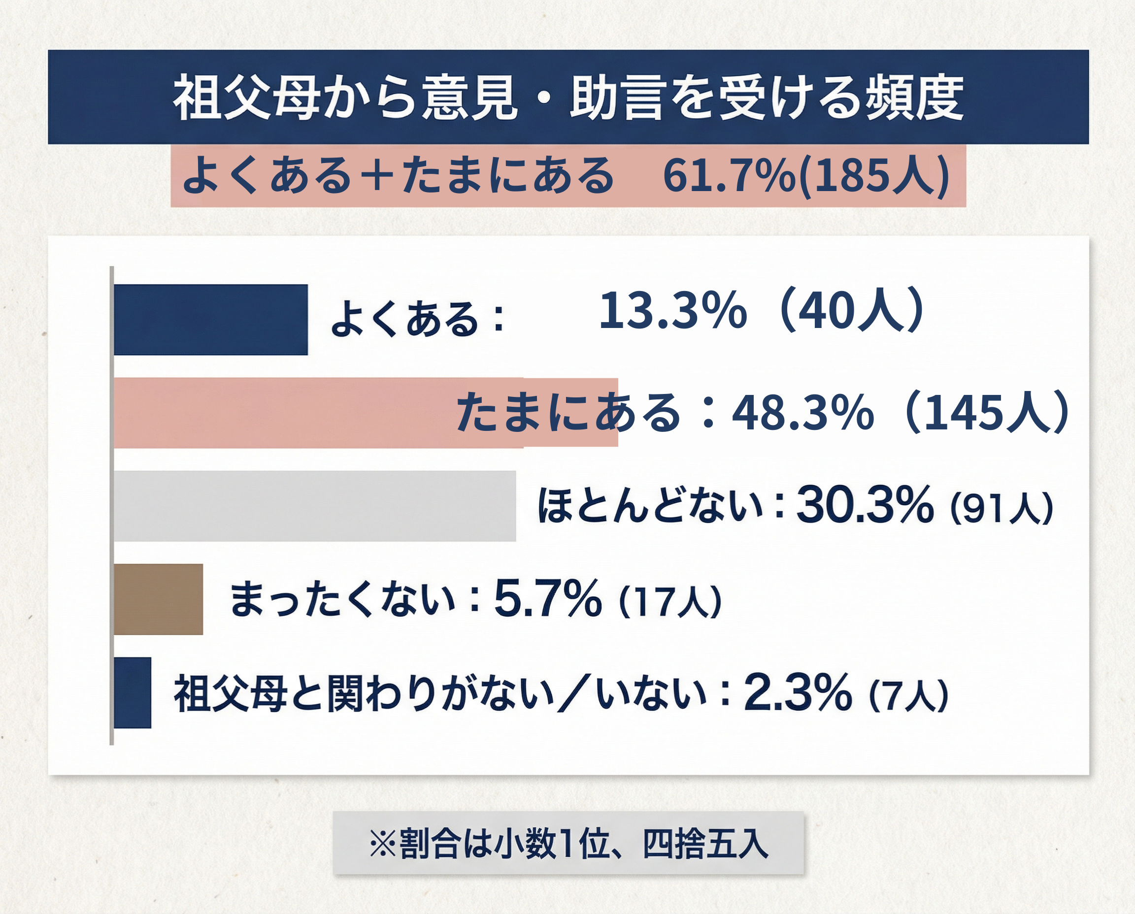 【結果1】祖父母から意見・助言を受ける頻度――よくある+たまにあるで61.7%(185人)