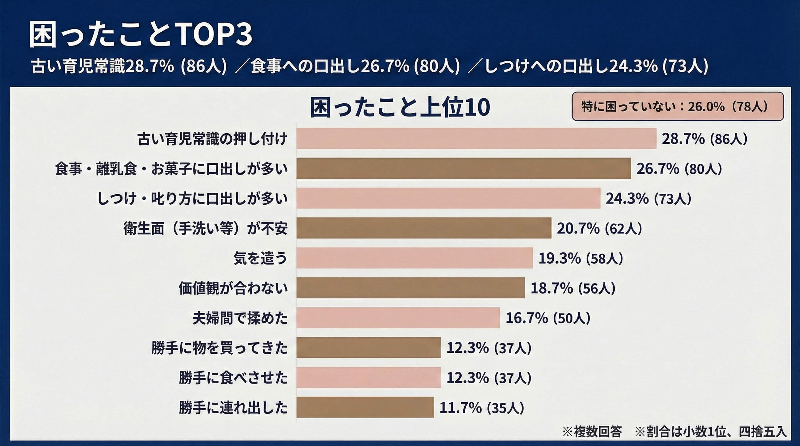 - 困ったことTOP3は古い育児常識の押し付け28.7%(86人)、食事への口出し26.7%(80人)、しつけへの口出し24.3%(73人)