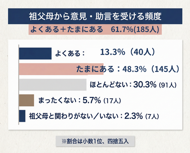 「よくある」「たまにある」を合わせると 61.7%(185人) にのぼり、6割以上の家庭で、祖父母から何らかの意見や助言を受けている実態が明らかになりました。