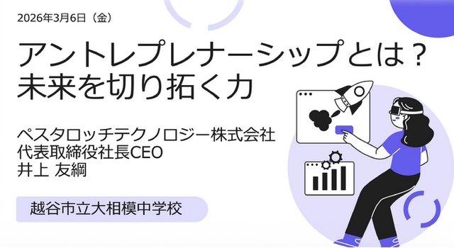 アントレプレナーシップ推進大使に任命されているPestalozzi Technology株式会社(本社:東京都新宿区、代表取締役社長CEO井上 友綱)の代表の井上が、2026年3月6日(金)、越谷市立大相模中学校にて、中学2年生を対象としたアントレプレナーシップ教育の特別授業を実施しました。