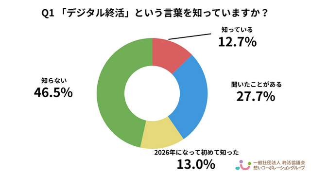 「知っている(12.7%)」と「聞いたことがある(27.7%)」を合わせると約4割となり、「デジタル終活」という言葉の認知は一定程度広がっていることがうかがえます。一方で「知らない(46.5%)」が最も多く、言葉自体の認知はまだ十分に浸透していない状況が見られます。また「2026年になって初めて知った(13.0%)」という回答もあり、最近になって情報に触れた層も一定数存在していることが分かります。
