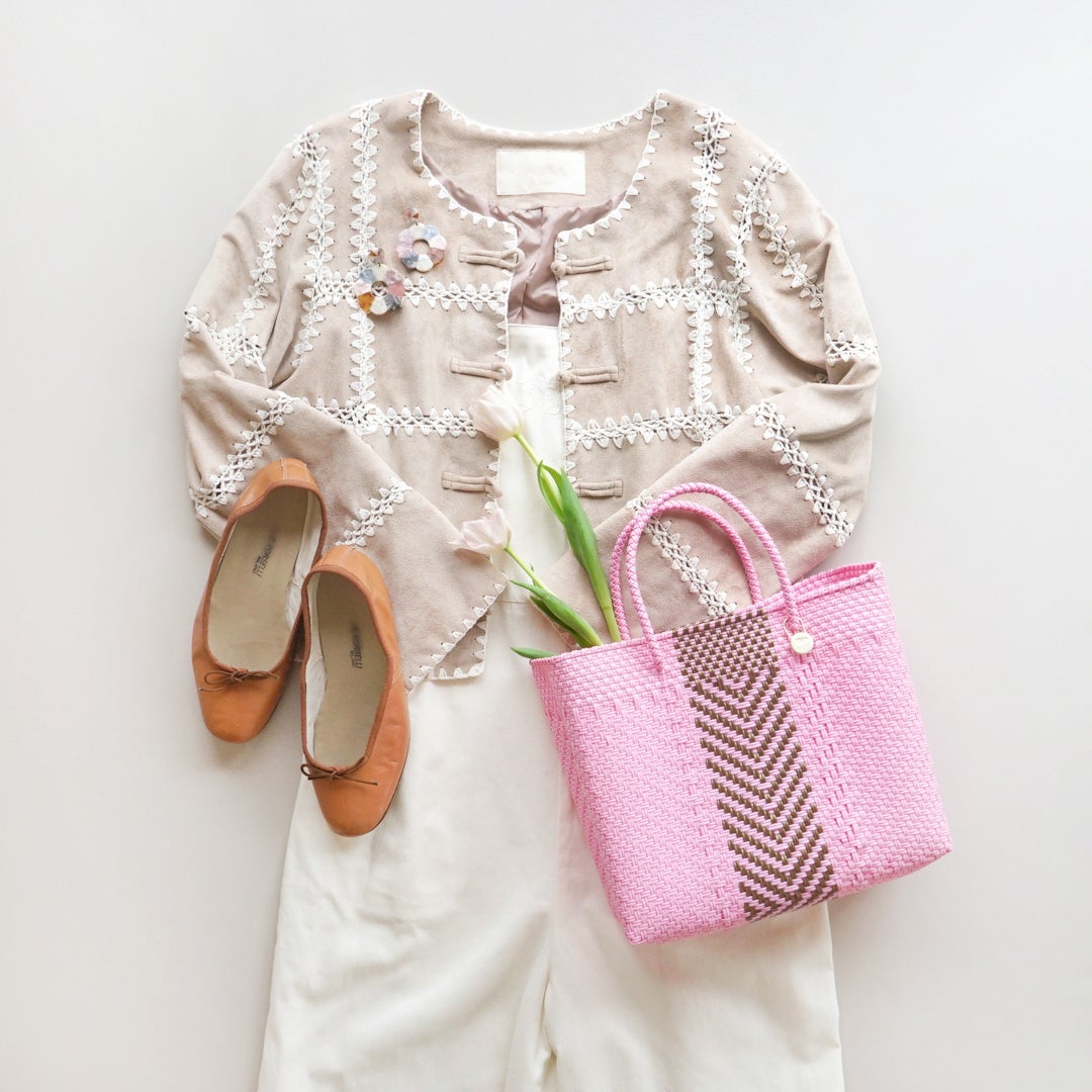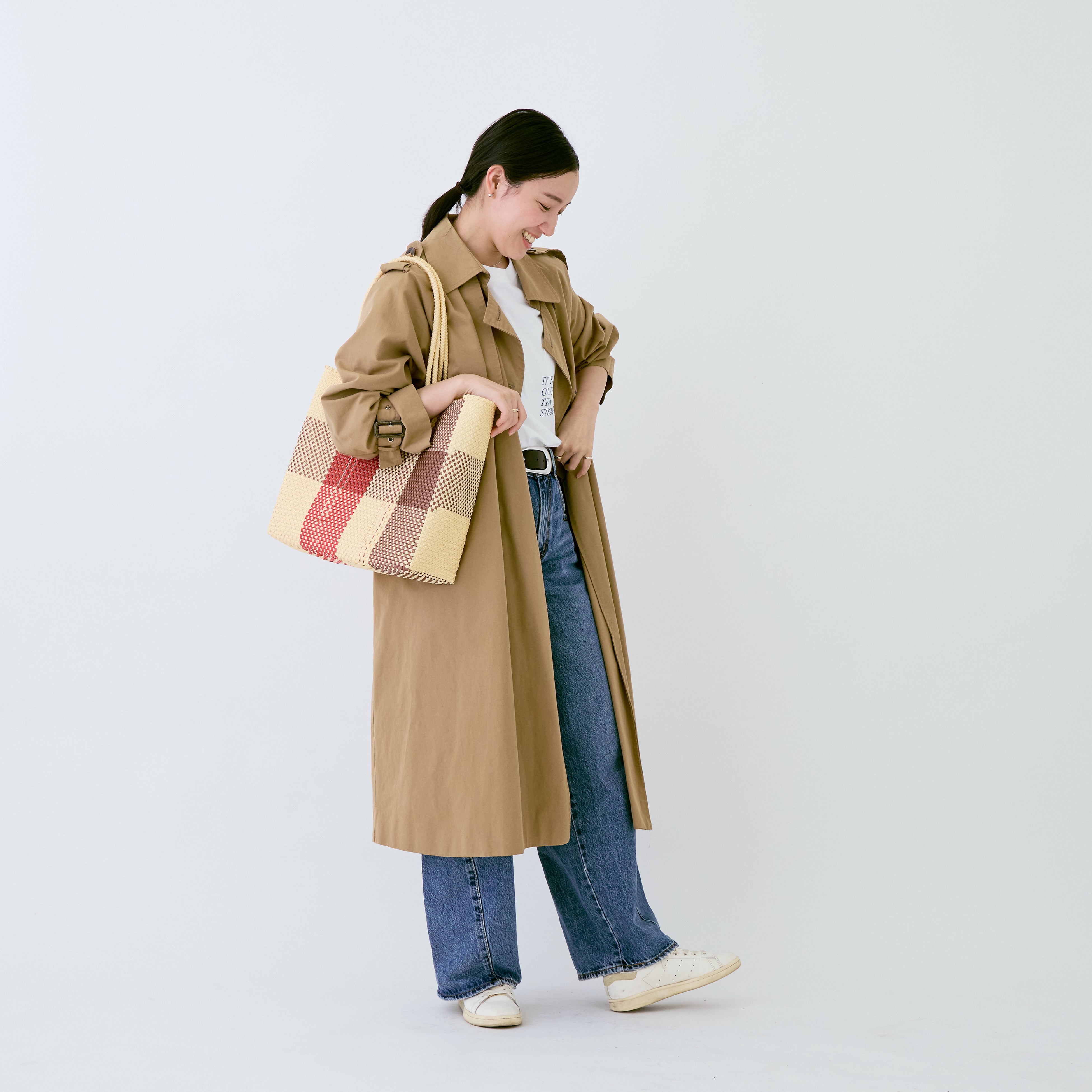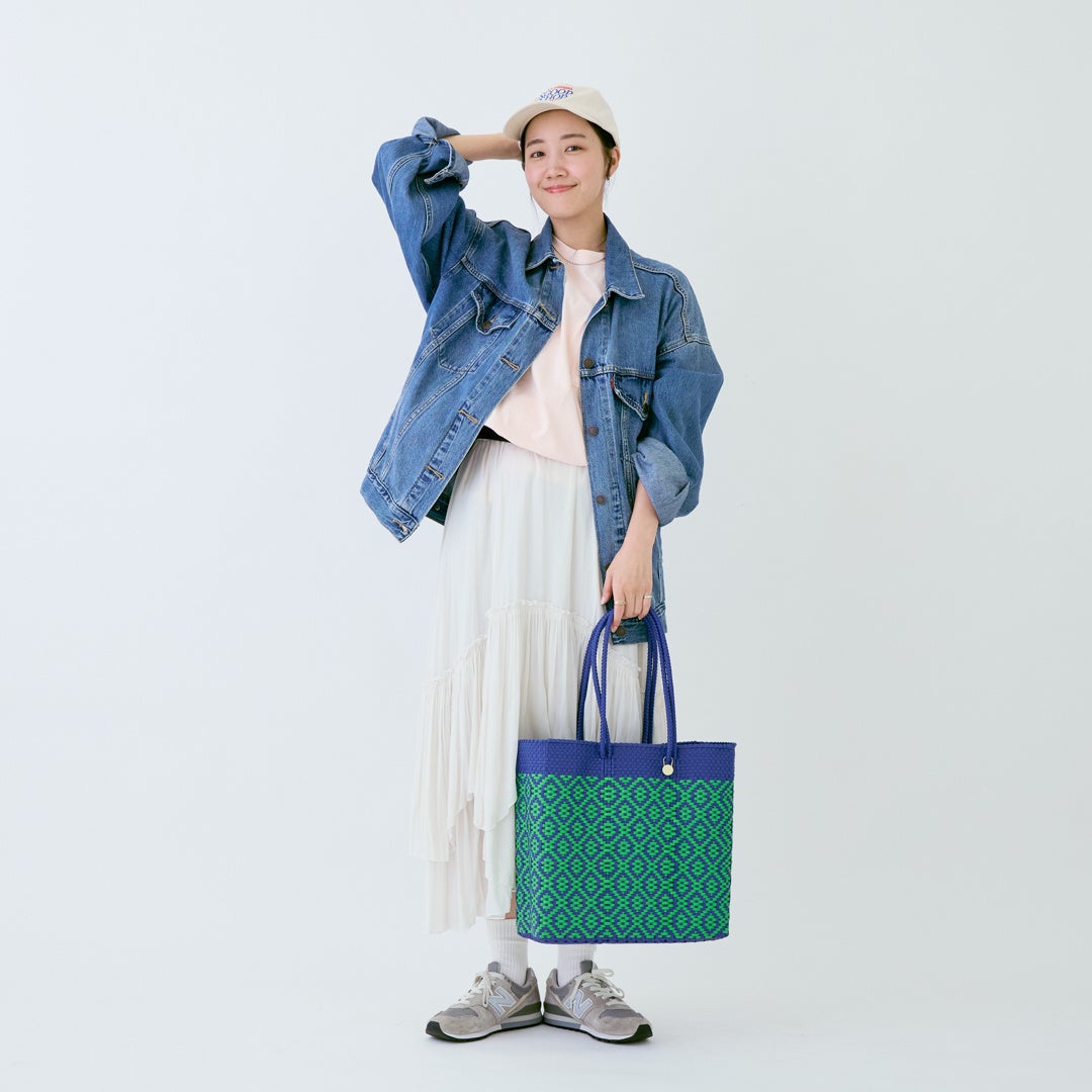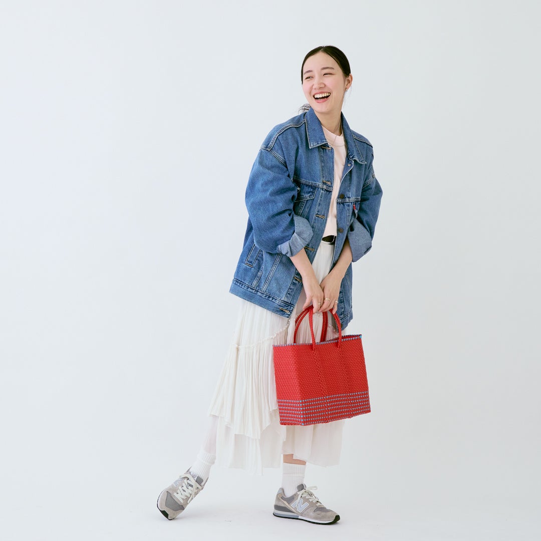 気軽に羽織れるアウターとして春も大活躍のデニムジャケット。デニム素材はメルカドバッグとの相性が抜群です。ピンクやオレンジ、グリーン等のビビットな色など、普段身に着けない色のバッグもデニムと合わせるとコーディネートに馴染んでくてます。