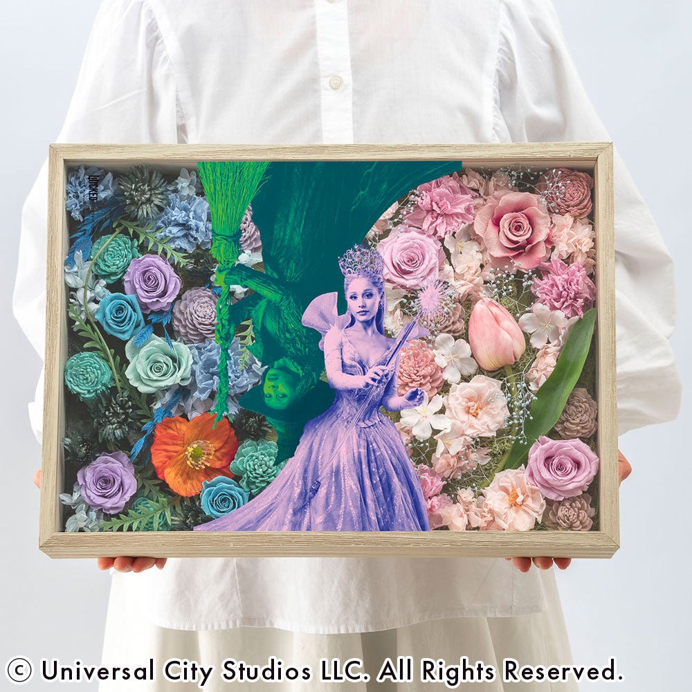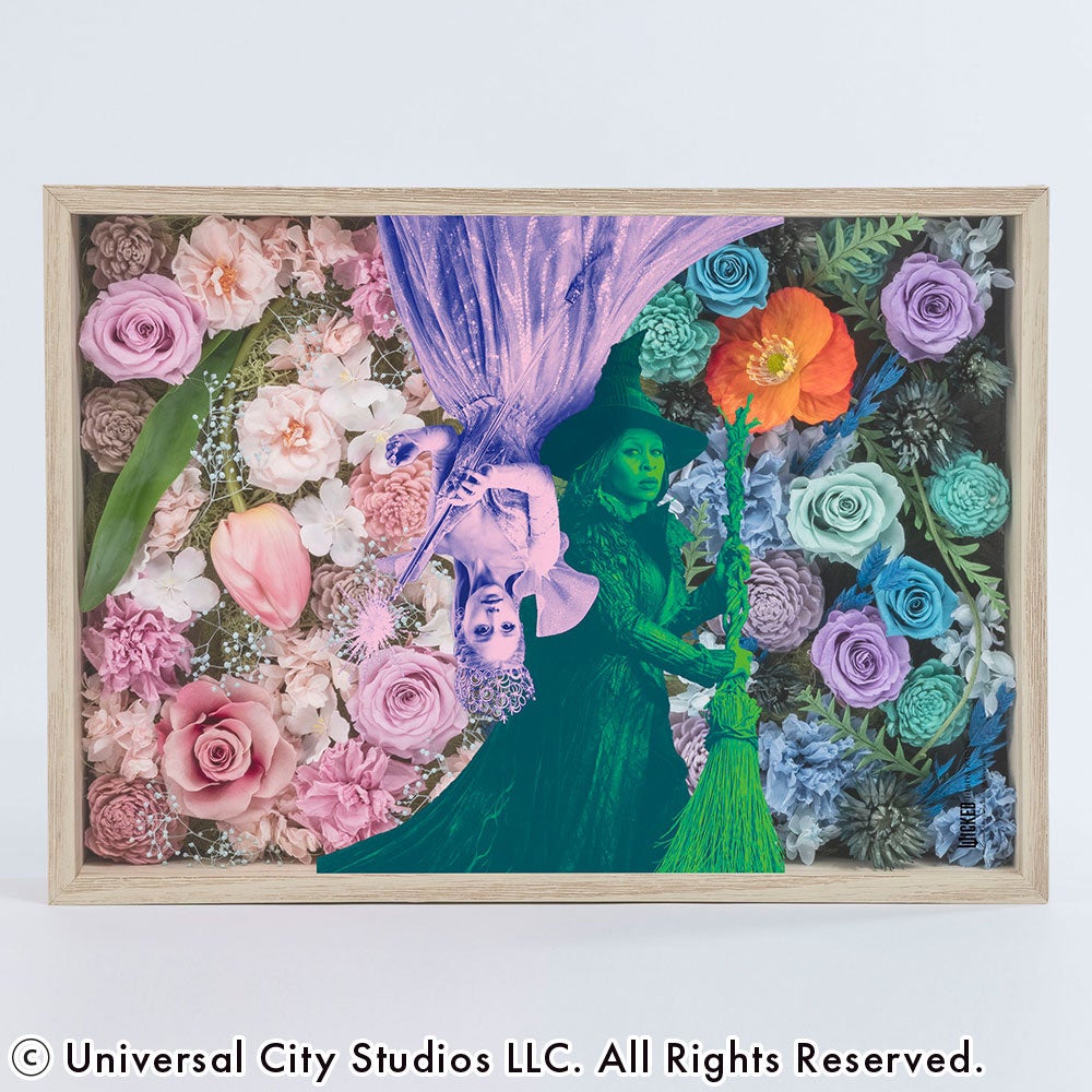 世界は、見る角度で変わる。二人の魔女が共演する、驚きの魔法。今回のコラボで最も贅沢な、スペシャルデザインが登場!最大の特徴は、フレームを逆さにすると、エルファバとグリンダそれぞれの世界観が主役として楽しめる仕掛け。 「物語をどちらの視点から見るか」で表情が変わるこのフレームは、まさに映画『ウィキッド』の深さを花で表現した唯一無二のアートです。 二人の絆を象徴する鮮やかなコントラストをお部屋に迎えて、その日の気分で魔法を掛け替えてみてください。