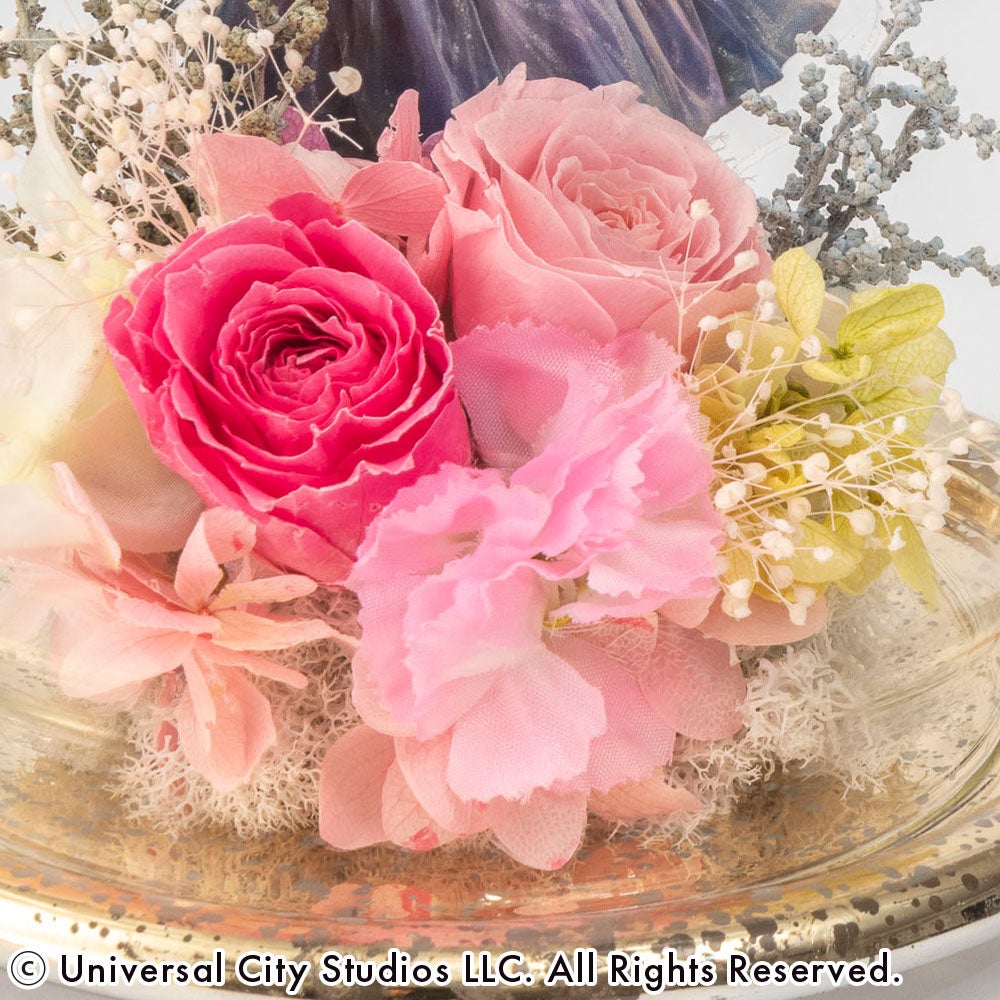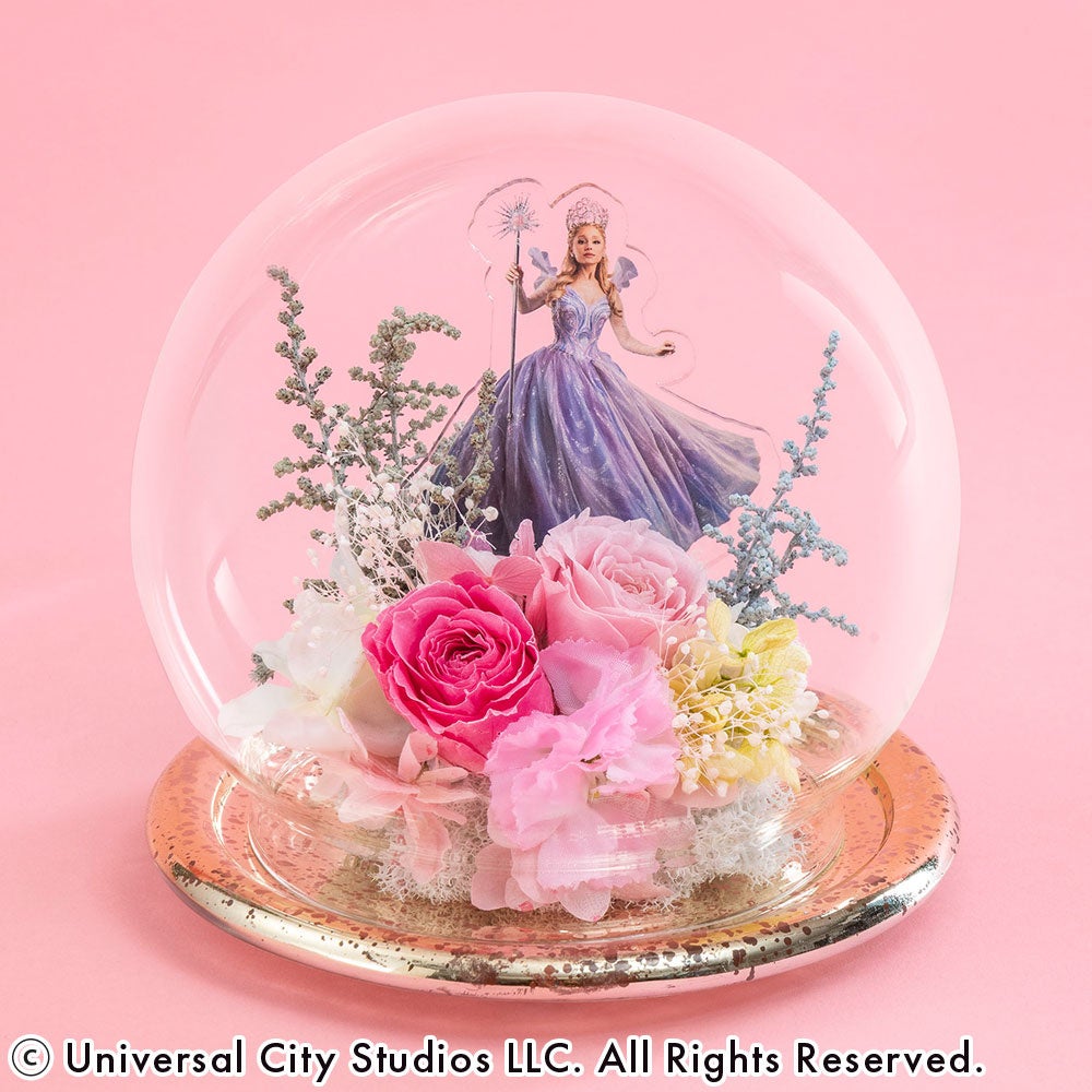 お部屋に「可愛い!」の魔法をかけて。みんなが大好きになる、グリンダの弾ける魅力をピンクの花々で表現しました。ガラスドームの中でキラキラと輝く姿は、まるで彼女が振りまく魔法の粉のよう。飾るだけでお部屋がハッピーな空気に包まれる、ご褒美感たっぷりのフラワーアイテムです!