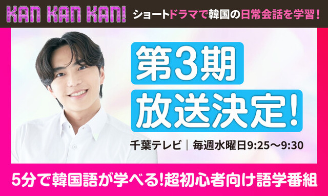 株式会社アクセントエース(東京都中央区)は、代表のスンジュンがレギュラー出演する韓国語学習番組『KAN・KAN・KAN!』第3期の放送が決定したことをお知らせします。前回・前々回放送が好評を博したことから、今回の3期目放送が実現しました。番組は2026年4月1日(水)~6月24日(水)まで、千葉テレビにて毎週水曜日の朝9:25~9:30に放送されます。