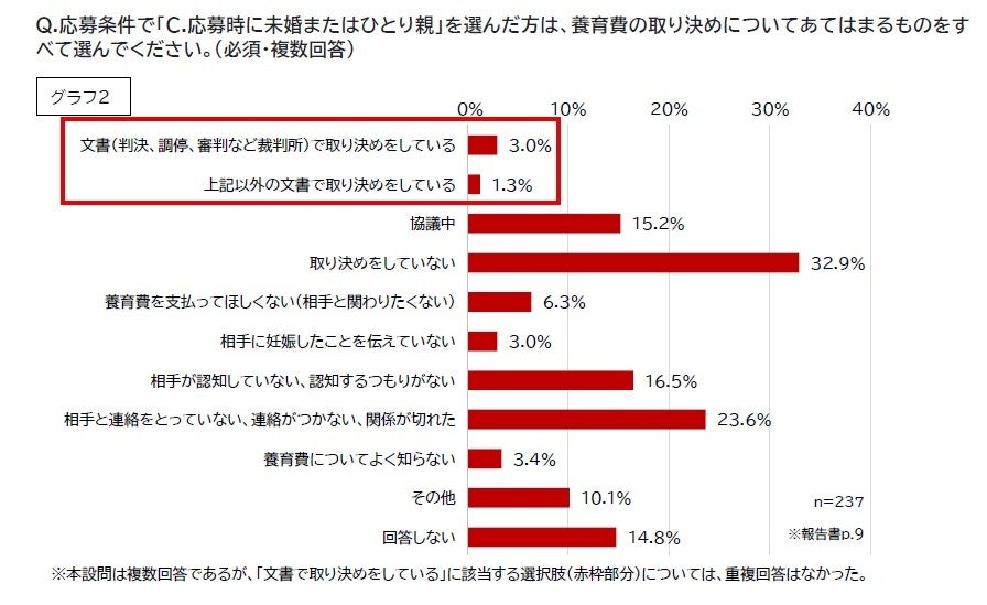 一般応募について、応募条件で「応募時点で未婚またはひとり親」と回答した人のうち、養育費について文書で「取り決めをしている」との回答は4.3%にとどまり、「取り決めをしていない」が32.9%と最も多かった。次いで「相手と連絡をとっていない、連絡がつかない、関係が切れた」は23.6%だった。本来養育費は、子どもの権利として確保されるべきものである。