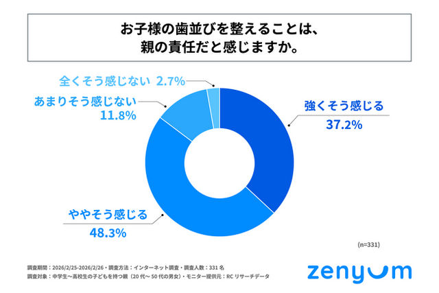 親が子どもの歯並びに対して感じる責任感や、それに伴う不安への対処方法は、現代の親にとって重要な関心事の一つです。子どもの歯並びは、成長期の健康や将来の自信にも影響を与えるため、親は大きな責任を感じていますが、歯科矯正の情報過多や経済的負担への懸念から、その責任感が過度なプレッシャーや不安につながる実態が社会的な関心を集めています。そこで、株式会社Zenyum Japanは、中学生~高校生の子どもを持つ親を対象に、「子どもの歯並びに対する親の意識調査」を実施しました。