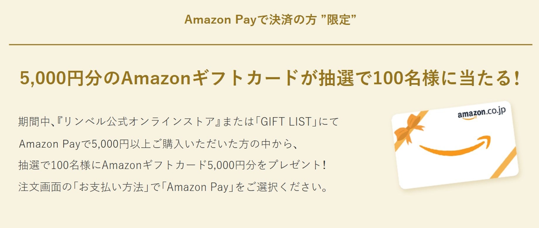 期間中に『リンベル公式オンラインストア』または『GIFT LIST公式サイト』にてAmazon Payで5,000円(税込)以上ご購入いただいた方の中から、抽選で100名様にAmazonギフトカード5,000円分をプレゼント。