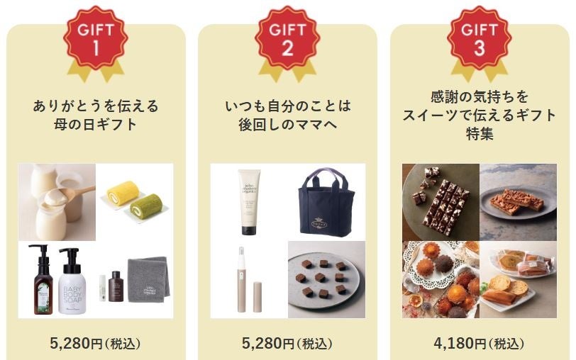 その他にもスイーツやおしゃれで実用的な雑貨、旬のさくらんぼに加え、カタログギフトとグルメのセットなど母の日に人気のギフトを取り揃えているほか、贈る相手別のおすすめギフトなども紹介しています。