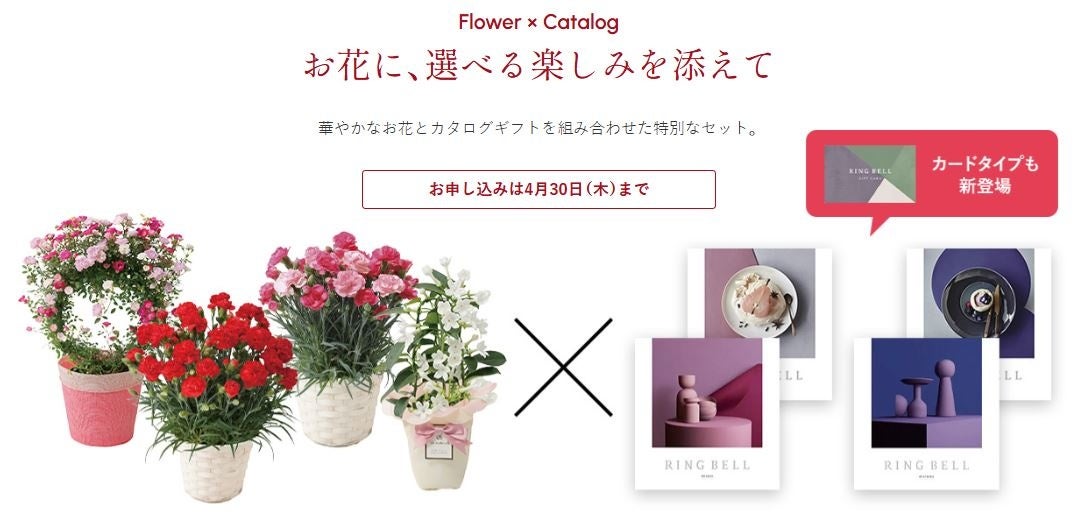 リンベルの母の日ギフトで毎年好評のお花とカタログギフトのセット。お花はカーネーション・マダガスカルジャスミンに加え、今年は新たにつるバラをご用意しました。ピンクのバラには「感謝」のメッセージが込められ、母の日のギフトにおすすめです。合わせるカタログギフトも今年はカードタイプが登場。ご予算やお好みに合わせて、全10種類(7,480~11,660円 税込)よりお選びいただけます。