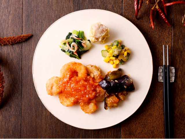 甘酒と塩麹を隠し味に、辛味と酸味をまろやかに引き立てた深みのあるチリソースが自慢。ぷりぷりの海老や、旨味を吸い込んだ揚げナスにたっぷりと絡めてお召し上がりください。