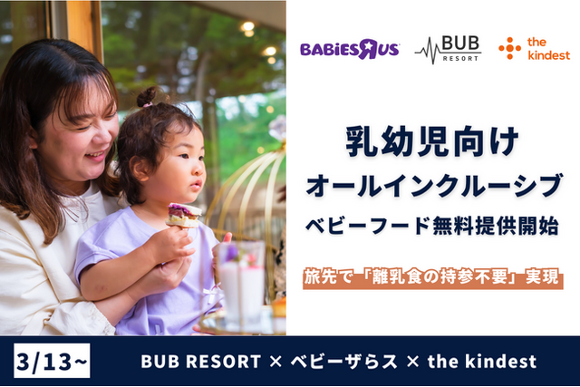 株式会社BUB(本社:東京都品川区)は、国産ベビーフードブランド「the kindest(株式会社MiL)」、「ベビーザらス(日本トイザらス株式会社)」が展開するベビー用品シリーズ「dear BABY」と連携し、乳幼児向けの離乳食を、2026年3月13日よりBUB RESORT Tsukubaにて提供開始します。
