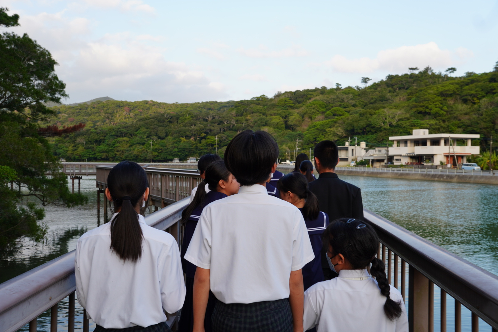 中学生達が大浦区をフィールドワークする様子。