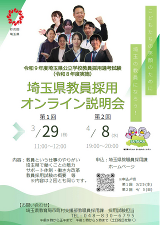 また、埼玉県の教員を目指す方が誰でも気軽に参加していただけるオンライン説明会を開催します。