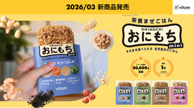 株式会社vitom(本社:東京都品川区東五反田1-6-3、代表取締役:林幹晟)は、完全栄養食「おにもち」シリーズのエクステンション商品として、新商品 「おにもち mini(オニモチ ミニ)」 を3月12日(木)より新規注文受付開始いたします。