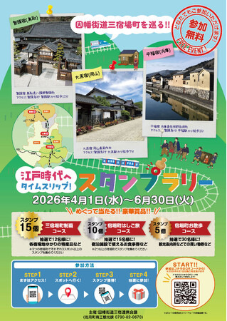 因幡街道沿いに点在する宿場町を、「街道旅」としてつなぐ取り組みとして、「平福宿(兵庫県佐用町)」「大原宿(岡山県美作市)」「智頭宿(鳥取県智頭町)」を舞台に、デジタルスタンプラリーが、2026年4月1日(水)~6月30日(火)まで開催されます。