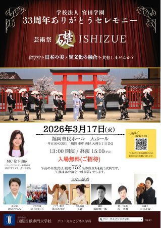 この度、日頃の感謝の気持ちを込め、福岡市民ホールにて「33 周年ありがとうセレモニー」と題し、第 1 部(午前)に卒業式、第 2 部(午後)に芸術祭を開催いたします。本イベントは、卒業を迎える留学生の門出を祝うとともに、本学の建学の精神である「日本伝統文化を礎とした多文化共生社会」を実現するグローカルな学園を目指す一環として開催致します。日本の伝統芸能と、留学生が持つ多様な文化、そしてそれらが融合した新しい表現を一つの舞台で披露することで、学生たちに「本学で学んだ誇り」を胸に刻んでもらい、対外的にはグローカルな教育成果を発信することを目的とします。