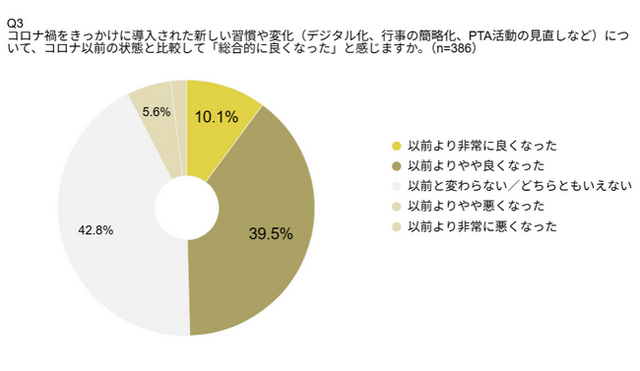 <Q3.>コロナ禍をきっかけに導入された新しい習慣や変化(デジタル化、行事の簡略化、PTA活動の見直しなど)について、コロナ以前の状態と比較して「総合的に良くなった」と感じますか。一方、小学校生活の変化については、「以前より非常に良くなった」(10.1%)、「以前よりやや良くなった」(39.5%)と、49.6%の約半数が肯定的に回答しました。