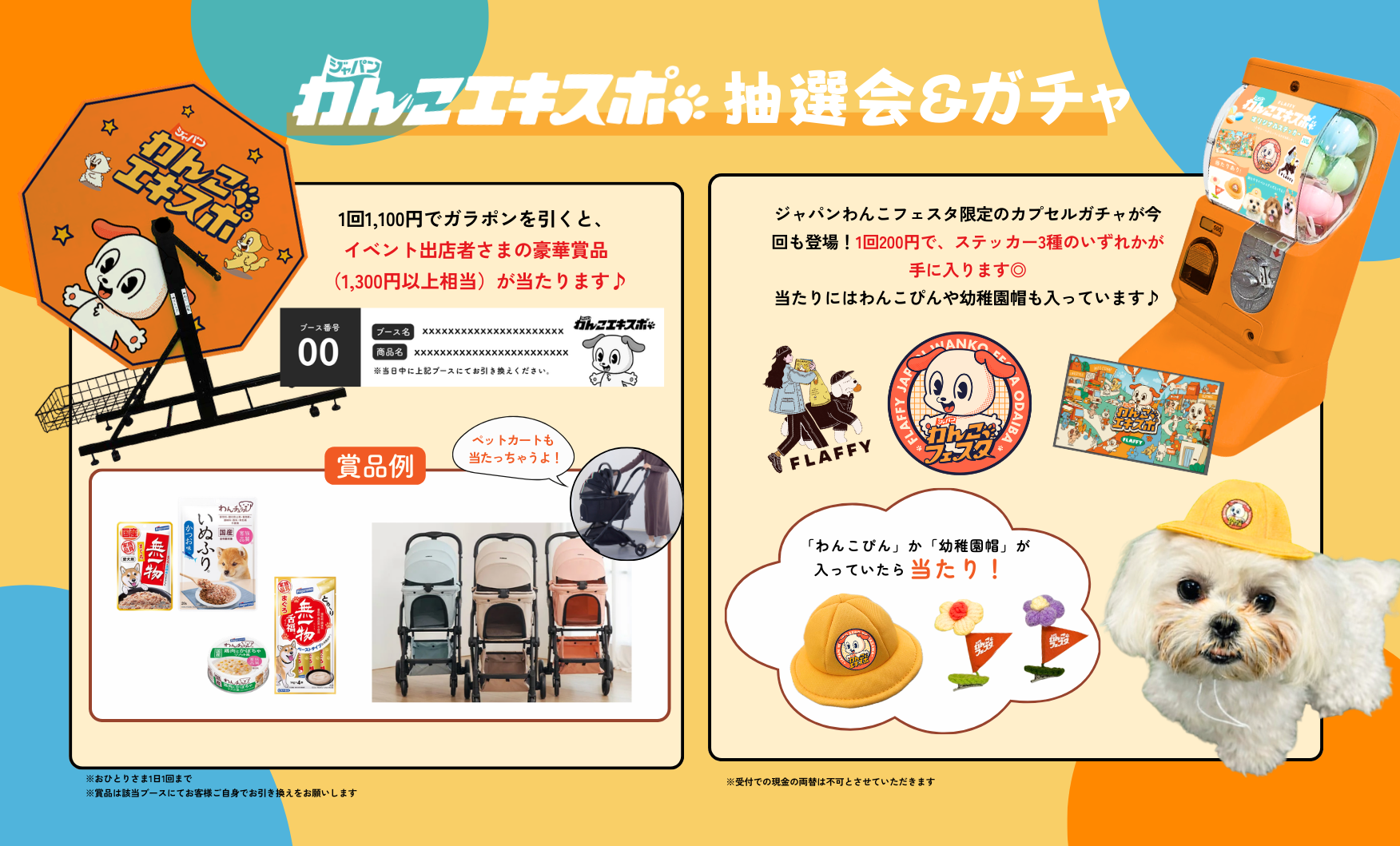 会場には、前回大盛況だった「わんわん抽選会」と、イベント限定のカプセルガチャも登場します!「わんわん抽選会」は1回1,100円でガラポンを回すと、出店者さま提供の1,300円以上相当の豪華賞品が必ず当たるお得な企画。愛犬用おやつやケア用品など、嬉しいアイテムが盛りだくさん。また、会場限定カプセルガチャ(1回200円)では、3種類のオリジナルステッカーのほか、当たりには“わんこピン”や“幼稚園帽”などの特別アイテムが入っている場合も!