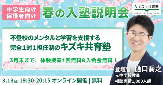 2026年3月20日(金)、生徒さんのメンタルと学習をサポートする完全個別指導塾・キズキ共育塾は、無料のオンライン入塾説明会を実施します。