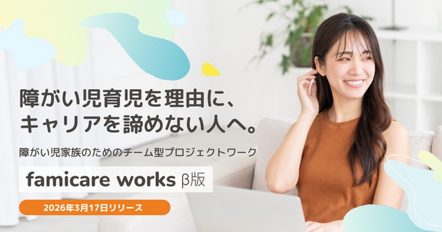 「疾患・障がい児家族の毎日を楽しく!」を目指すファミケア(運営:株式会社NEWSTA 代表:鈴木碩子)は、疾患・障がい児を育てながらもプロとして仕事に関わり続けたい人のためのチーム型プロジェクトワークサービス「ファミケアワークス」のβ版提供を開始します。