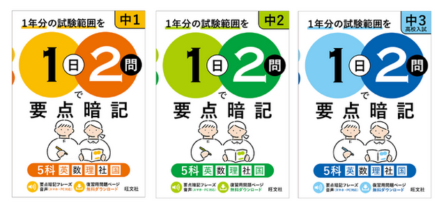 教育出版の株式会社旺文社(東京都新宿区/代表取締役社長 粂川秀樹)は、『1日2問で要点暗記 中1 5科』『1日2問で要点暗記 中2 5科』『1日2問で要点暗記 中3・高校入試 5科』を3月17日(火)に刊行いたしました。