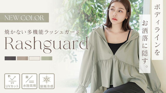 [画像2: https://prcdn.freetls.fastly.net/release_image/68630/247/68630-247-d270f75506b65ea5fdd9fc357242f2cd-1140x640.jpg?width=536&quality=85%2C75&format=jpeg&auto=webp&fit=bounds&bg-color=fff ]フリルラッシュガードは、二の腕ラインをカバーするキャンディースリーブと、ウエストラインをカバーする胸下の切り替えで着痩せ効果抜群。