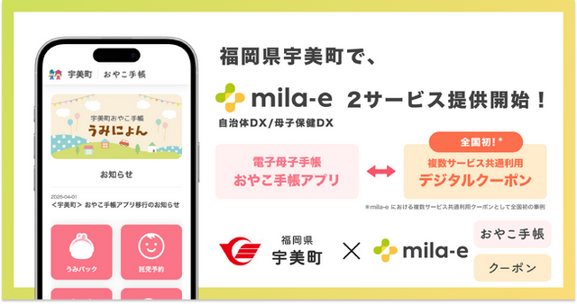 自治体向けサービスを開発する株式会社ミラボ(本社:東京都千代田区、代表取締役:谷川一也、以下「ミラボ」)は、母子手帳アプリ「mila-e(ミライー) おやこ手帳」、デジタルクーポンサービス「mila-e クーポン」の福岡県 宇美町への導入が決定し、2026年4月1日より運用を開始します。