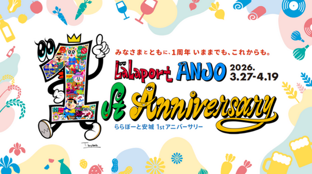 三井不動産商業マネジメント株式会社(本社:東京都中央区、代表取締役社長:大林 修)が運営する三井ショッピングパーク ららぽーと安城は、地域の皆さまに支えられ開業1周年を迎えます。日頃よりご愛顧いただいているお客様への感謝の気持ちを込め、地域との連携をさらに深める「LaLaport ANJO 1st Anniversary」を2026年3月27日(金)~4月19日(日)の期間で開催いたします。