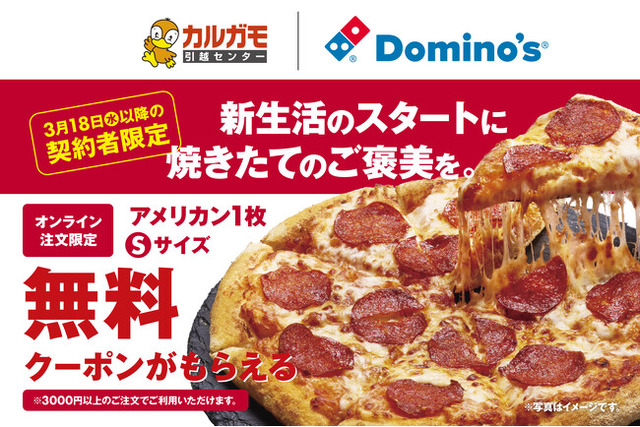 株式会社ドミノ・ピザ ジャパン(代表取締役兼CEO:ディーター・ハーベル、本社:東京都品川区、以下:ドミノ・ピザ)が展開する国内No.1シェアを誇る宅配ピザチェーン ドミノ・ピザは、カルガモ引越センター株式会社(本社:東京都、以下:カルガモ引越センター)とコラボレーションし、新生活を迎える皆さまを応援する「春の引っ越し応援キャンペーン」を実施いたします。本キャンペーンでは、2026年3月18日(水)以降にカルガモ引越センターでお引っ越しをご契約された方を対象に先着で、ドミノ・ピザ3,000円以上のご注文時にご利用いただける「アメリカン」Sサイズ1枚無料クーポンをプレゼントいたします。