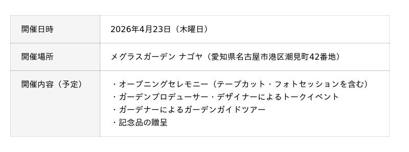 4月23日(木曜日)のオープンにあわせ、開園式を開催します。当日は、ご来賓として広沢 一郎 名古屋市長にお越しいただくほか、当園のガーデンプロデューサー 塚本 こなみ氏・ガーデンデザイナー 小倉 珠子 氏によるトークイベント、ガーデナーによるガーデンガイドツアーなどを予定しています。[表: https://prtimes.jp/data/corp/160852/table/47_1_e999a434e41a202f04762f99724787e1.jpg?v=202603180316 ]