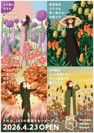 地域共生施設「Megrass Garden Nagoya(メグラスガーデン ナゴヤ)」は、4月23日(木曜日)のオープンにあわせ、同日、開園式を開催します。また、オープンを記念し制作したキービジュアルや、クルーズ名古屋(水上バス)ご乗船のお客さま対象の内覧会ご招待企画などについてお知らせします。