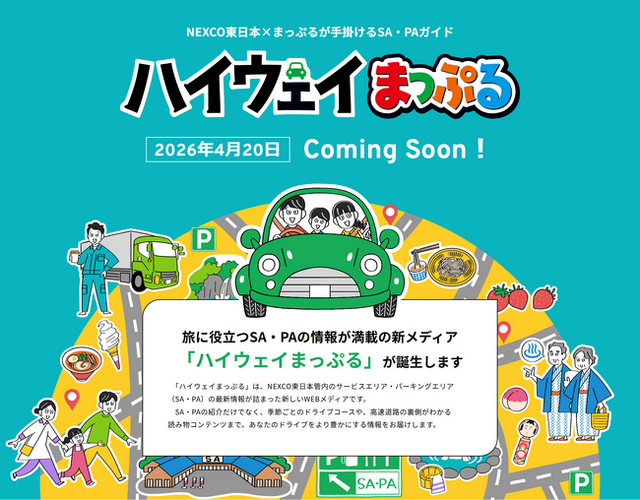 NEXCO東日本(東京都千代田区)と株式会社ネクスコ東日本エリアトラクト(東京都港区)は、株式会社昭文社(東京都千代田区)と共同で、NEXCO東日本管内のサービスエリア・パーキングエリア(以下「SA・PA」という。)に関する情報を発信する新WEBサイト『ハイウェイまっぷる』を、4月20日(月)から公開します。
