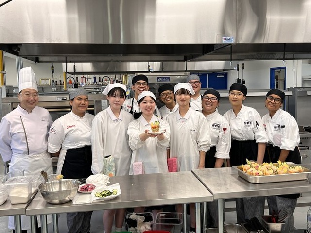 グアムコミュニティーカレッジとの交流イベントとして、優勝したメニューの「じゃわ愛(めぐ)すしこパフェ」を、地元の学生や在ハガッニャ日本国総領事館の公邸シェフと一緒に調理し試食を行い、地元の学生からは生花でのレイの作り方やチャモロ料理の作り方を学び、チャモロビレッジ(ナイトマーケット)では、買い物や食べ歩き等を行いました。