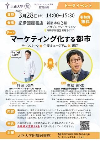 大正大学(学長:神達知純、所在地:東京都豊島区)の附属図書館は、2026年3月28日(土)に、紀伊國屋書店新宿本店(東京都新宿区)にて特別企画 「マーケティング化する都市-テーマパーク×企業ミュージアム×書店-」を開催します。