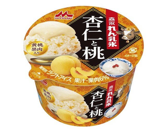 「森永れん乳氷 杏仁と桃」は、さっぱりとなめらかな食感の杏仁れん乳味のかき氷に濃厚なれん乳を合わせました。さらに杏仁と相性の良い黄桃果肉を加えることで濃厚でさわやかな風味とつぶつぶ食感が味わえ、アジアンスイーツの味わいが楽しめる氷菓カップアイスです。