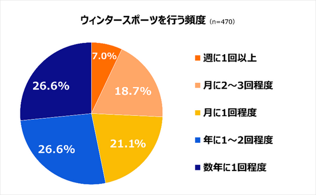 直近3年以内にウィンタースポーツを実施した方を対象に、所持している道具について尋ねたところ、「フルセット所有(板・ブーツ・ウェアなど一式)」が51.3%で最多となりました。また、実施頻度については「年に1~2回程度」(26.6%)と「数年に1回程度」(26.6%)が最も多く、次いで「月に1回程度」(21.1%)という結果になりました。
