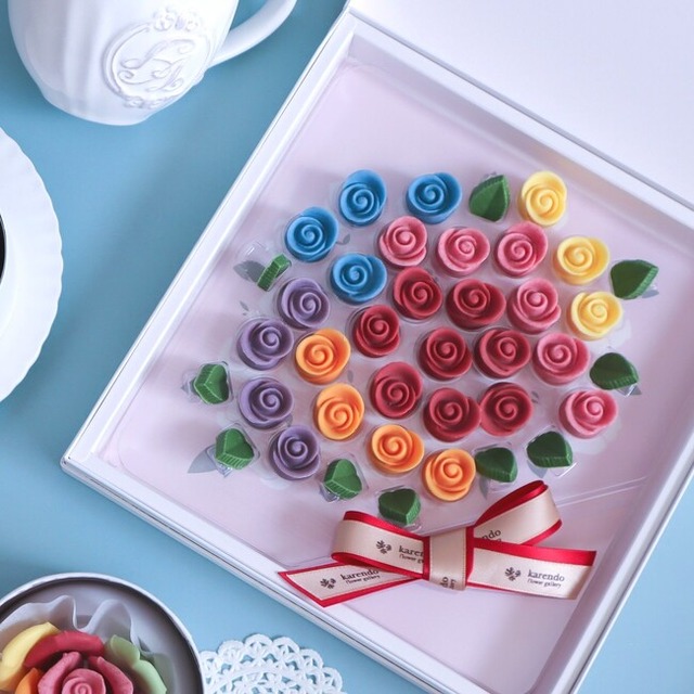 7色のバラのチョコレートを花束風にしたてたカラフルなチョコレート。