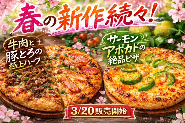 今回登場する新商品は、食べごたえのある贅沢なハーフ&ハーフと、春らしい彩りと爽やかな味わいを楽しめるピザです。ご家族でのお食事やホームパーティーはもちろん、お花見シーズンのテイクアウトにもぴったりな商品として提案します。