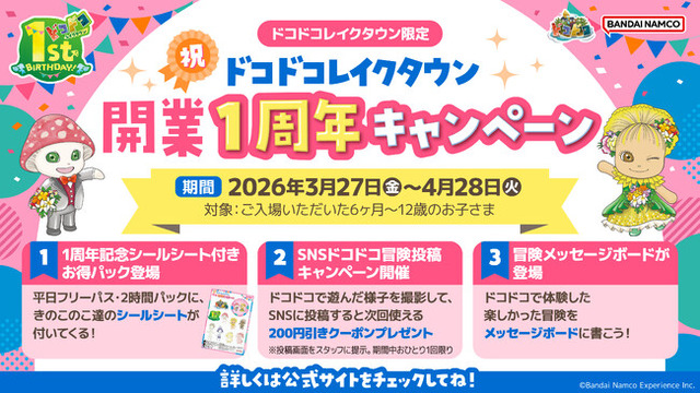株式会社バンダイナムコエクスペリエンスが企画・プロデュースする子どものあそび場『屋内・冒険の島 ドコドコ イオンレイクタウンmori』(埼玉県越谷市)は、2026年4月に開業1周年を迎えることを記念して、3月27日(金)~4月28日(火)の間、日ごろの感謝をこめた『祝 ドコドコレイクタウン開業1周年キャンペーン』を開催します。