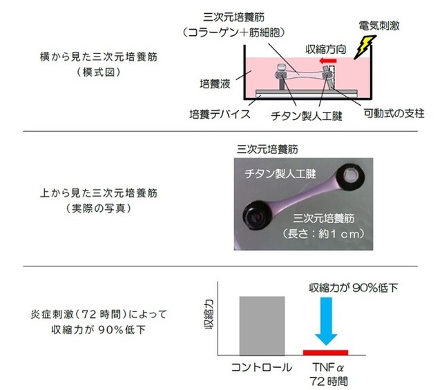 コラーゲン中で立体的に培養し、人工腱で固定した三次元培養筋は、電気刺激により実際に収縮する。炎症性物質 TNF-αの作用により、収縮力は著しく低下する(約90%低下)。