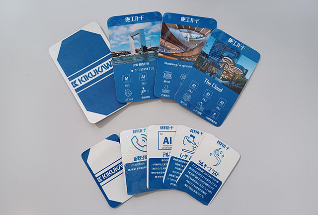 施工事例カードゲーム菊川の施工事例と技術をもとに考案されたオリジナルカードゲーム。内定者や新入社員を対象とする研修等で、楽しみながら自社の施工事例を学ぶのに役立つ。