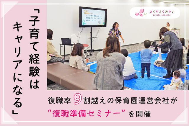 「子ども・保護者・職員」三者の笑顔に満ちた子育て環境の創出を目的に、東京を中心に保育園運営 を行う株式会社さくらさくみらい(本社:東京都千代田区、代表取締役社長:森田周平、以下「当社」) は、今春復職を予定する育休取得者を対象に「復職準備セミナー」を開催しました。本セミナーは、子育て中の社員のみで構成された「働くママパパ応援隊!!」が企画・運営したもので、制度説明だけでなく、実際に子育てをしながら働くリアルを共有し、復職後の働き方や今からできる準備を伝え、心理的負担の軽減や前向きな職場復帰を後押しする目的で開催されました。