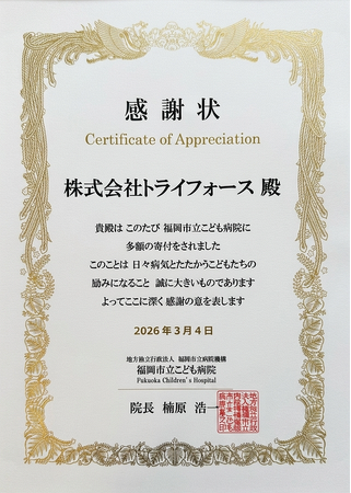 株式会社トライフォース(本社:東京都渋谷区、代表取締役:賀来 宗一郎)は、福岡市立こども病院の「療養環境整備基金」への寄付を開始したことをお知らせいたします。