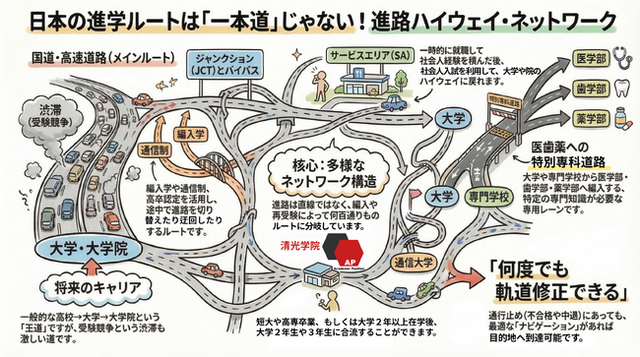 清光学院では、日本の進学制度を複数の進路が交差するネットワークとして整理し、「進学ハイウェイネットワーク」として図解しました。