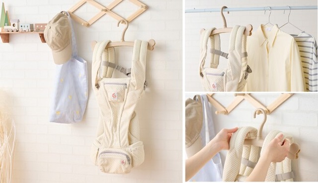 よだれや汗などの汚れが気になるから、頻繁に洗たくしたい抱っこひも。このハンガーなら干している間も型崩れしにくく、乾いたらいつもの置き場所へそのまま移動できます。